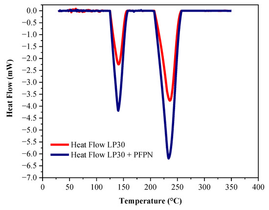 Endothermic curves of LP30 and LP30 + PFPN at β of 10 °C/min.