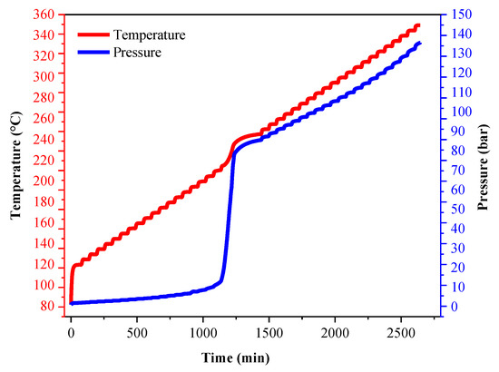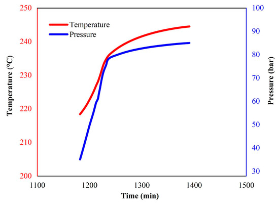 Temperature and pressure versus time (0–2700 min) curves of LP30 + PFPN.
