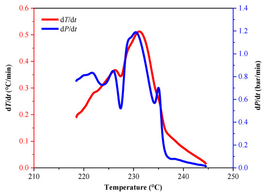 To further analyze the thermal decomposition behavior of the LP30 + PFPN electrolyte, we conducted an ARC experiment under pseudo-adiabatic conditions. The characteristic parameters of the experiment are listed in Table 3. As illustrated in Figure 4 and Figure 5, when the experiment had progressed by about 1180 min, the temperature of the reaction system reached about 220 °C. At this time, the temperature of the reaction system began to rise, and the pressure also increased. As shown in Figure 6 and Figure 7, when the experiment had been carried out for about 1225 min, the temperature of the reaction system reached about 231 °C, and the pressure reached approximately 70 bar. At this time, the heating rate and pressure rise rate reached their peak values, which were 0.51 °C/min and 1.2 bar/min, respectively.