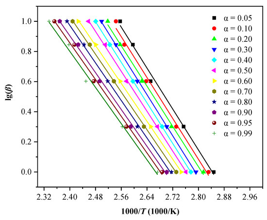 This method calculates the same reaction at different heating rates; when α is the same value, the G(α) is specific [33,38,39,40], as shown in the following Equation (3):