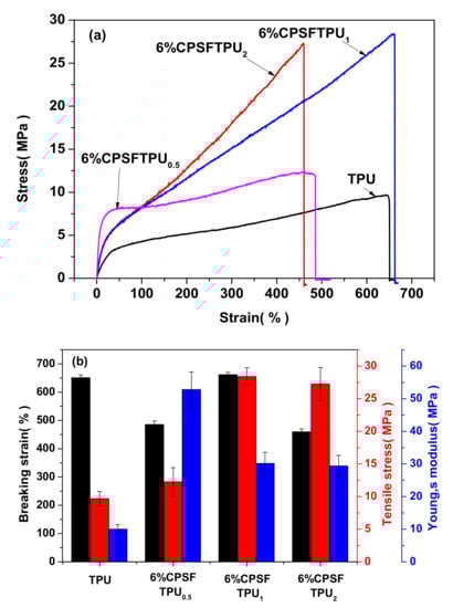 | Sample | Breaking Strain (%) | Tensile Stress (MPa) | Young’s Modulus (MPa) |