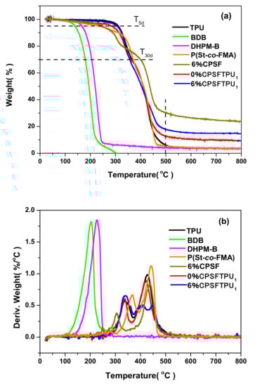 | Sample | T5d (°C) | T30d (°C) | Residual Weight at 500 °C (%) | Residual Weight at 800 °C (%) |