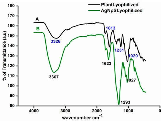 FTIR studies confirmed the surface functionality of the synthesized nanoparticles. Figure 2A,B display FTIR spectra of M. frondosa leaf extract and green synthesized AgNPs with nearly identical IR bands. Leaf extract showed vibration bands at 3326, 1612, 1231, and 1020 cm−1 corresponding to O–H stretching of an aromatic alcohol, amide I band, C–O stretching of alcohol, and C–N stretching vibration of the amine, respectively. In the case of AgNPs, the absorbance peak shifted from 3326 to 3367 cm−1 and from 1231 to 1296 cm−1 with increased band intensity, suggesting silver ion binding to the extract’s hydroxyl and carboxylate groups []. A change in the wavenumbers corresponding to amide I (1612–1623 cm−1) linkages was also visible in the FTIR spectra.