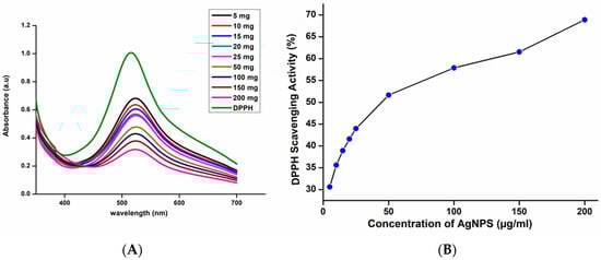 (A) UV–Visible spectra of DPPH with different concentrations of AgNPs (B) DPPH scavenging activity of AgNPs.