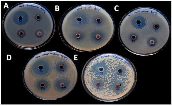 Antimicrobial activity of AgNPs against: (A) Pseudomonas aeruginosa(B) Escherichiacoli (C) Staphylococcusaureus (D) Streptococcus mutans (E) Candida albicans.
