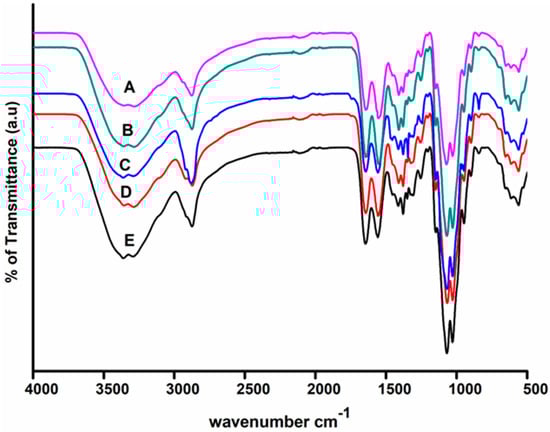 FTIR spectra of (A) CG (2% chitosan, 2% gelatin, 0.5% PEG, 0.075% AgNPs) (B) CG1 (2% chitosan, 2% gelatin, 0.5% PEG, 0.0075% AgNPs) (C) CG2 (2% chitosan, 2% gelatin, 0.5% PEG, 0.0125% AgNPs) (D) CG3 (2% chitosan, 2% gelatin, 0.5% PEG, 0.025% AgNPs) (E) CG4 (2% chitosan, 2% gelatin, 0.5% PEG, 0.05% AgNPs).
