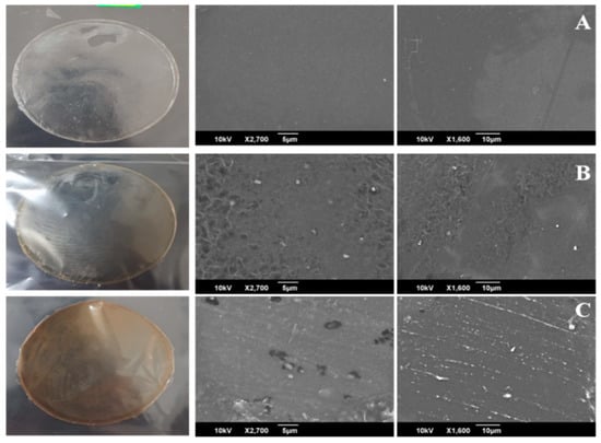 The SEM micrographs of CG and CG4 composites films have represented in Figure 7. SEM images of plasticized CG films without nanoparticles are relatively smooth, good compatibility, and homogenous []. As we observed in Figure 7B,C, white spots on the polymer surface confirmed the existence of AgNPs on polymer matrix []. When the concentration of nanoparticles increases within the polymer matrix, we noticed the increase of white spots on the surface. When 0.05% of AgNPs added to the CH–GE matrix, the slight agglomeration of particles observed. The findings are similar to the previous report []. These nanoparticles were tightly adhered to the CH–GE matrix, potentially altering the physical and chemical properties of the films.