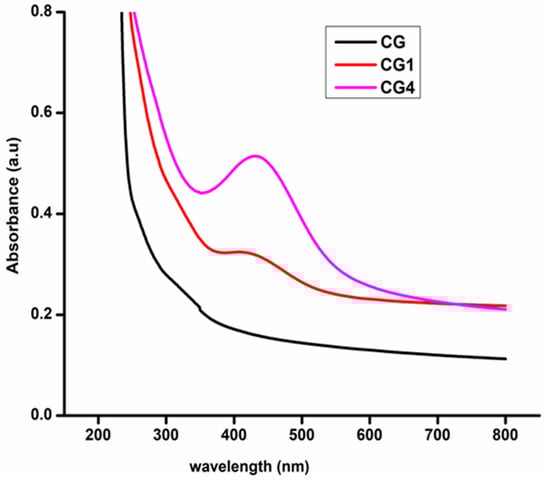 The UV–Vis absorption spectra of the films are depicted in Figure 8. The blank CG films didn’t show any absorbance in UV–Visible spectra, but with the addition of AgNPs, we noticed an absorbance peak between 390–470 nm []. When the concentration of AgNPs increases within the matrix, then the absorbance also gets increases. The opacity of the fabricated films was obtained from UV–Visible spectra by taking the absorbance at 600nm. Among the fabricated films, CG films show the least opaque and higher transparency than the other films. As the concentration of AgNPs in the CH–GE matrix increases, the films become more dark, opaque, and less transparent. A similar trend in the opacity values for the chitosan/ZnO/neem oil composite films was mentioned by Sanuja et al. []. The addition of nanoparticles prevents visible and ultraviolet light from penetrating the packaging film and perforating the food material within it, potentially preserving nutrients, color, and flavor []. Table 2 illustrates the opacity values of various fabricated films.