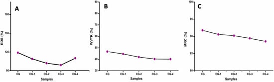 The rate at which water vapor passes through the film is known as the water vapor transmission rate. For applications that need effective polymer barriers, such as food packaging, protective coatings and so on, determining the WVTR of nanocomposite films is essential. The WVTR of plasticizer added films is consistently higher because it reduces the intermolecular interaction between the polymer chains and increases the molecular spaces between the polymer matrixes, leading to enhanced permeability through plasticized films []. AgNPs have a cross-linking effect in the CH–GE matrix, causing polymeric chains to become more compact, reducing interstitial spaces in the polymer matrix, and slowing water molecule diffusion through the films []. As a result, the WVTR of the films decreases. Incorporation of AgNPs to the polymer matrix causes reduction of WVTR described in Rhim et al. []; the WVTR of montmorillonite-loaded cellulose acetate/polyethyleneglycol film was also reduced when the nanoparticle concentration was increased, according to Saha et al. []. Food packaging materials should have a low WVTR to prevent moisture exchange among the food and the nearby environment []. The Water Vapor Transmission Rate (WVTR) of various films is shown in Figure 9B.