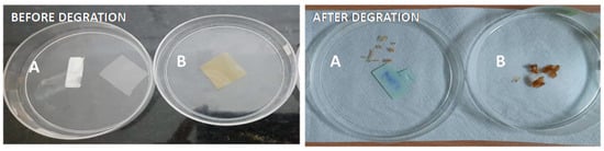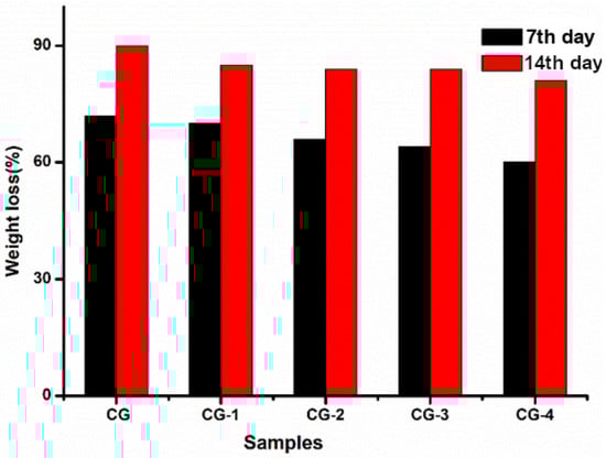 The degradation of the composite films in soil was studied to evaluate their biodegradability in natural conditions. It was observed that, when the CG composite films were exposed to the soil for 14 days, the films become fragile and hard and shrink (Figure 10). Figure 11 depicts the film’s biodegradation rates over time as determined by weight loss. The soil’s moisture could easily seep into the polymer network and weaken the polymer chains; hence, it is easily attacked by soil microorganisms []. After 14 days, CG composite films showed the highest percentage of degradation; as the percentage of AgNPs increases in the matrix, the degradation of films decreases may be due to the antimicrobial activity of AgNPs [].