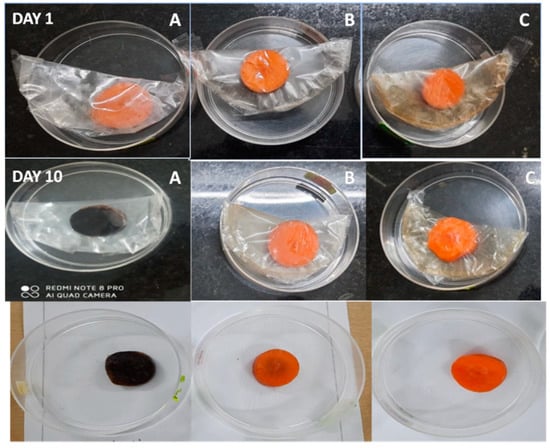Food packaging applications of fabricated films were analyzed using the spread plate method described in Saral Sarojini et al. []. The cut piece of carrot with the same size, shape, and color was used for food packaging testing of composite films. Pure CG and CG4 films were freshly fabricated and taped around each cut piece of carrot. Plastic (polyethylene) film was used as a control to cover carrot pieces and kept undisturbed. The carrot samples were examined using the serial dilution and spread plate procedure on the tenth day of storage. Then, 1 g of carrot in 10 mL of sterile distilled water was used to make 10−1 microbial suspension. Serial dilutions of the microbial suspension were done. A volume of 0.1 mL of suspensions from the dilutions were spread plated over the surface of sterile nutrient agar medium and incubated for 24 h at room temperature. The isolated colonies were counted by the colony-forming unit (CFU) method after 24 h of incubation [].