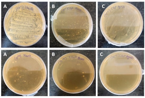 The antibacterial ability of composite films was evaluated through the spread plate method after 10 days of storage: (A) Polyethylene films (B) CG (C) CG4.