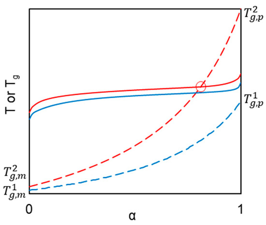 Schematic illustration of the effect of the polymer Tg value on the reactivity of a monomer. Dashed lines represent variation of Tg with conversion (α); solid lines represent α–T plot obtained at the heating rate β.