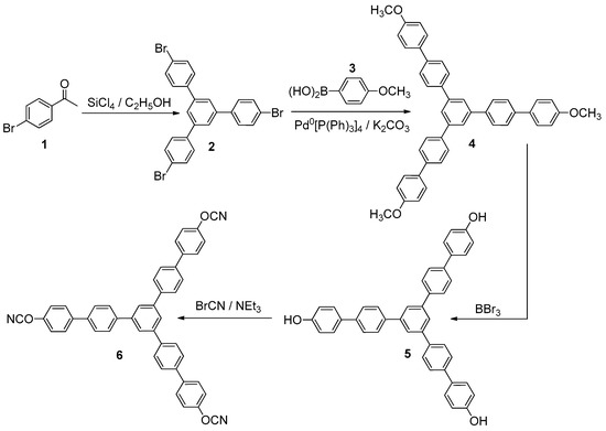 - Kotha, S.; Kashinath, D.; Lahiri, K.; Sunoj, R.B. Synthesis of C3-Symmetric Nano-Sized Polyaromatic Compounds by Trimerization and Suzuki−Miyaura Cross-Coupling Reactions. Eur. J. Org. Chem. 2004, 2004, 4003–4013. [Google Scholar] [CrossRef]