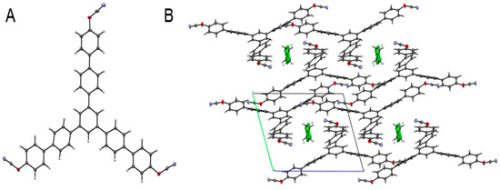 Single-crystal X-ray crystallographic structure of synthesized tricyanate ester 6 (H atoms—light grey, C atoms—dark grey, N atoms—blue, O atoms—red, Cl atoms—green) (A). Crystal packing of tricyanate ester 6 view along a axis (B).