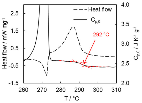As mentioned earlier, the kinetics of the cross-linking polymerization can be convoluted by a transition from a kinetic- to a diffusion-controlled regime, which is usually observed near the glass transition temperature of the reaction mixture. This transition is accompanied by a change in the kinetic parameters of the polymerization process and usually correlates with vitrification, because the latter is associated with a dramatic increase in viscosity and, thus, with diffusional retardation. To detect vitrification during the cyanate polymerization, temperature-modulated DSC measurements (TMDSC) were employed. The technique separates contributions of the reversing (vitrification) and non-reversing (polymerization) components into the measured total heat flow [31]. Due to the difference in the heat capacities of the liquid and glassy states, vitrification manifests itself as a step change in the temperature dependence of the heat capacity. As shown in Figure 5, the quasistatic heat capacity, Cp,0, determined from the reversing heat flow, reveals such step change. The mid-point of the heat capacity step is found at 292 °C. The exact conversion value related to this transition is difficult to determine because of the partial overlap of the melting and polymerization peaks. However, it is clear that it occurs at the later polymerization stages, probably at α > 0.9. In principle, this means that the respective kinetics of polymerization may undergo a transition to a diffusion-controlled regime at the later polymerization stages.