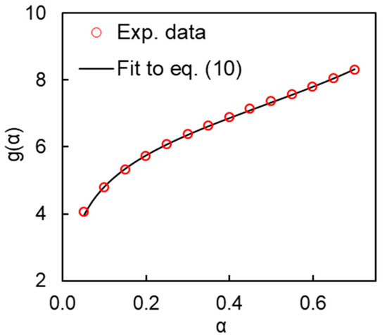 Figure 8 demonstrates the ability of Equation (9) to fit the numerical g(α) data obtained from the experimental values of Eα and Aα via Equation (6). To perform fitting, Equation (9) is converted to the integral form as follows: