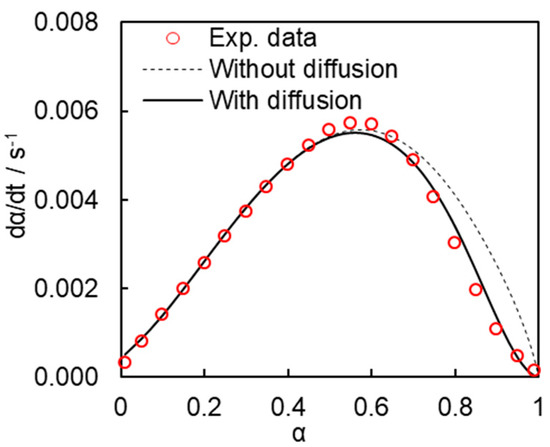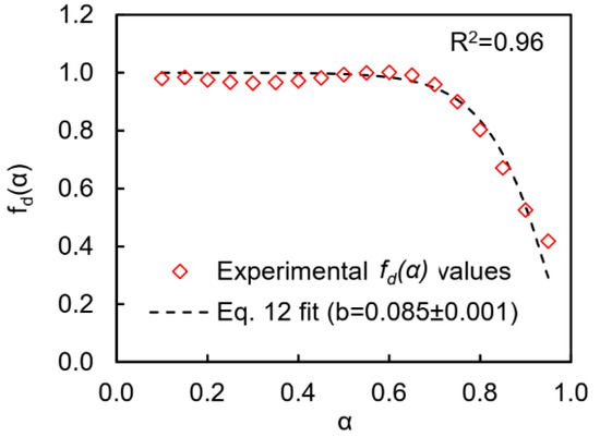 where αf is the final conversion and b is an empirical parameter. The goodness of the fit of Equation (12) to calculated fd(α) values is shown in Figure 9.