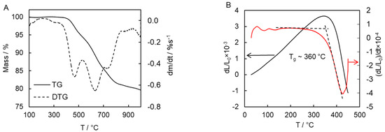 TG and DTG curves of thermal decomposition of polymerization product at 10 °C min−1 (A); TMA measurements for polymerization product (B).