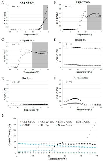 Temperature dependence of the loss modulus (G″, ●) and storage modulus (G′, ○) of (A) CS/β-GP 12%, (B) CS/β-GP 20% (C) CS/β-GP 28%, (D) ORISE™ gel, (E) Blue Eye™, and (F) normal saline. (G) Temperature dependence of the complex viscosity of all samples including CS/β-GP 0% as a control solution.