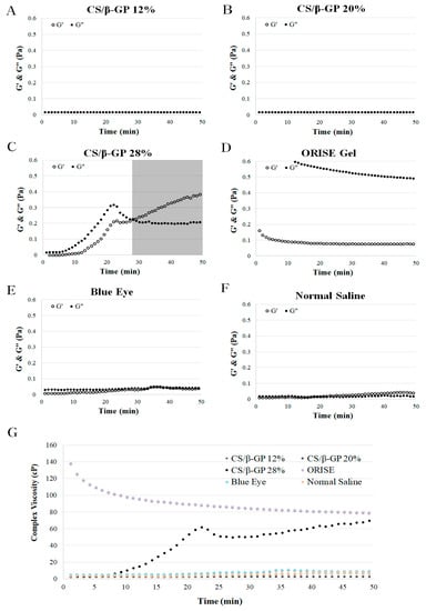 Time dependence of the loss modulus (G″, ●) and storage modulus (G′, ○) of (A) CS/β-GP 12%, (B) CS/β-GP 20%, (C) CS/β-GP 28%, (D) ORISE™ Gel, (E) Blue Eye™, an (F) normal saline conditions at 36.5 °C. (G) Time dependence of the complex viscosity of all samples.