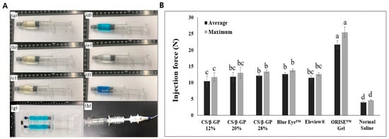 (A) Various submucosal injection agents to evaluate injection force; (a) CS/β-GP 12% (b) CS/β-GP 20% (c) CS/β-GP 28% (d) Eleview® (e) normal saline (f) Blue Eye™ (g) ORISE™ gel (h) Endoscopic needle. (B) Injectability of the chitosan thermosensitive solutions (CS/β-GP 12%, CS/β-GP 20% and CS/β-GP 28%) and existing commercial submucosal injection agents. The average injection force and the maximum injection force were recorded for each sample (n = 5, ANOVA, Fisher’s LSD test, p < 0.05). Same letters indicate that there is no statistically significant difference between the samples.