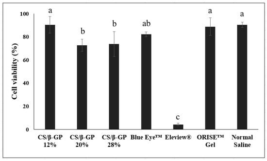 Cytotoxicity of the chitosan thermosensitive solutions (CS/β-GP 12%, CS/β-GP 20% and CS/β-GP 28%) and commercial submucosal injection agents (n = 4, ANOVA, Fisher’s LSD test, p < 0.05). Same letters indicate that there is no statistically significant difference between the samples.