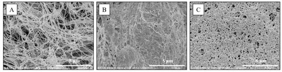 Submucosa surface examination using FE-SEM (A) normal saline, (B) Blue Eye, (C) CS/β-GP 20%. (Scale bar is 5 μm).