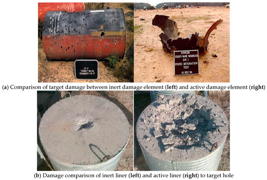 The damage effects of inert damage element and active damage element on target hole and interior are compared.