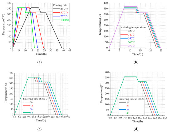 Figure 3. Sintering process curve under four control factors. (a) Cooling rate sintering process curve; (b) Sintering temperature sintering process curve; (c) Holding time at 360 °C sintering process curve (d) Holding time at 315 °C sintering process curve.