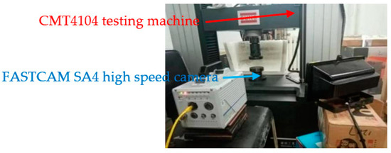 The experimental arrangement is shown in Figure 4. The quasi-static compression test was carried out on 13 groups of experimental specimens using a CMT4104 microcomputer-controlled electronic universal testing machine. The experimental loading strain rate is 0.1 /s, the corresponding pressure head uniform pressing rate is 60 mm/min, the maximum experimental force is 50 kN, the accuracy level is 0.5, the voltage is 220 V, and the power is 0.4 kW. In order to obtain stable and reliable data, at least three repeated experiments were carried out on each group of experimental specimens. Before the experiment, in order to reduce the friction between the indenter and the end of the specimen and help the transverse deformation of the end face of the specimen, a proper amount of Vaseline was applied on the end face of the specimen. All experiments were carried out at room temperature. The compression process of the test specimen was recorded using FASTCAM SA4 high-speed camera. The shooting speed is 50 fps, the resolution is 512 × 512 ppi, and the starting trigger point is used to capture. A FEINOVA450 scanning electron microscope (SEM) was used to analyze the microstructure of the bottom surface of the specimen. A Rigaku smartlab9 X-ray diffractometer (XRD) was used for phase analysis of the sintered specimens.