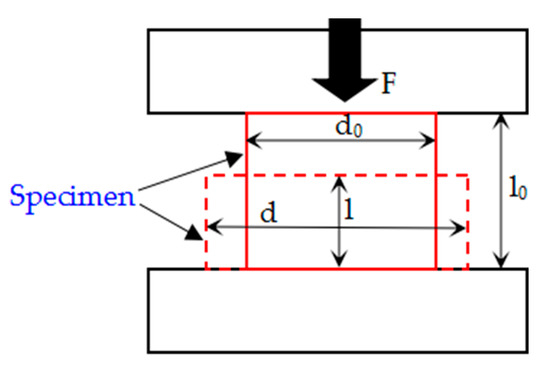 In order to facilitate the transformation between the engineering stress and strain and the real stress and strain, it can be considered that all experimental specimens always keep the cylindrical shape and volume unchanged during the compression process, and the deformation and size of the specimens are shown in Figure 5. The true strain and true stress can be obtained as follows: