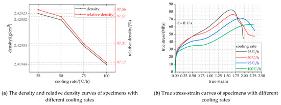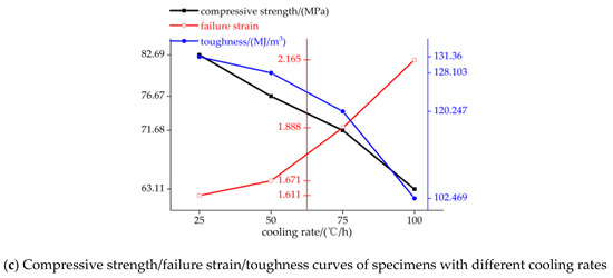 The cooling rate determines the crystallization rate of PTFE matrix, which affects the crystallinity of PTFE matrix and further affects the properties of PTFE-based active materials. The density and relative density curves, true stress-strain curves and compressive strength/failure strain/toughness curves of specimens with different cooling rates are shown in Figure 6a–c, respectively. The specific parameters of Figure 6a,c are listed in Table 6.