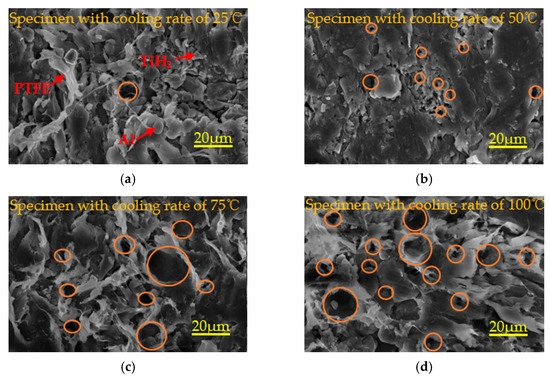 Figure 7 shows the micro morphology of the specimens sintered at different cooling rates, and the chocolate yellow circles show the voids. With the increase of cooling rate, the time for the PTFE matrix inside the specimen to decrease from 360 °C amorphous melting state to 315 °C cold crystallization melting state decreases gradually, which creates the phenomenon of an increasing vibration amplitude of PTFE matrix atoms and gradually decreasing particle atoms and also the phenomenon of irregular diffusion of PTFE matrix atoms and gradually weakening particle atoms, resulting in the number of internal voids filled by the PTFE matrix molten state gradually decreasing. Therefore, the crystalline surface of the PTFE matrix decreases and the void increases gradually. Before sintering, the accumulation order of PTFE matrix and particles inside the specimen is established via an external force, which will be destroyed due to the thermal movement of molecules during sintering. At the end of sintering, there is shrinkage of the PTFE phase change crystal volume and the internal stress increases, and the voids and other structural defects appear during cooling. It can be seen from Figure 7 that with the increase of cooling rate, the number of voids in the specimen increases gradually, the cohesion between the PTFE and particles decreases, the crystallinity decreases gradually, and the crystalline volume shrinkage of PTFE increases gradually. This is because with the increase of cooling rate, the crystalline volume of the PTFE matrix has no time to shrink. Therefore, the above findings can be used as a powerful explanation for the decrease of mechanical properties such as strength and density of materials with the increase of cooling rate.