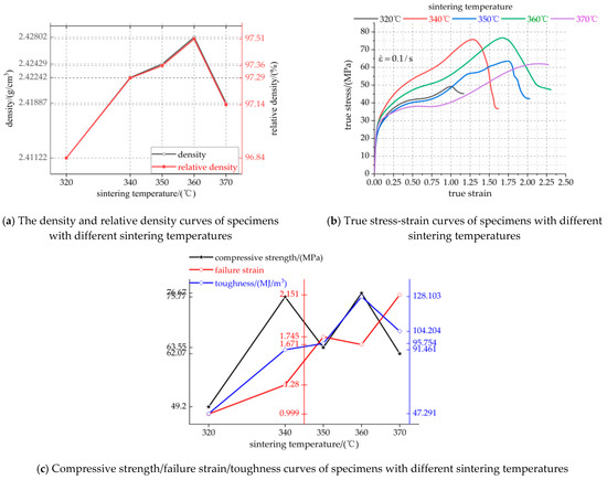 The density and relative density curves, true stress-strain curves and compressive strength/failure strain/toughness curves of specimens with different sintering temperatures are shown in Figure 8a–c, respectively. The specific parameters of Figure 8a,c are listed in Table 7.