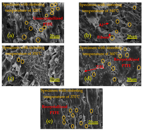 Figure 9 shows the microstructure of specimens sintered at different temperatures. Orange circles denote pores. As can be seen from Figure 9a, due to the sintering temperature of 320 °C, lower than the melting temperature of 327 °C of PTFE crystallization, only a small number of Al particles and TiH2 particles are wrapped in the PTFE matrix inside the specimen after heating, expansion, flow and non-recrystallization cooling, and most of the particles are exposed on the PTFE matrix. Therefore, the bonding between PTFE matrix and particles is not very tight, and there are a certain amount of pores with different volumes. As can be seen from Figure 9b,d, most of the particles are embedded in the recrystallized PTFE matrix, and a small number of particles are exposed on the PTFE matrix. The PTFE matrix is tightly bound to the particles, and there are a lot of pores. It can be seen from Figure 9c,e that most of the particles are exposed on the PTFE matrix, and there are a lot of pores. The phenomenon of pore formation may be due to the excessive residual stress released at high temperature during sintering, which leads to the existence of many pores inside the specimen. Therefore, excessive porosity is an important factor to decrease the strength of materials.