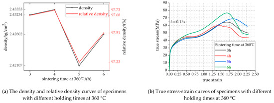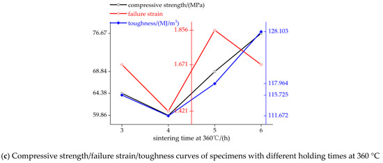 The density and relative density curves, true stress-strain curves and compressive strength/failure strain/toughness curves of specimens with different holding times at 360 °C are shown in Figure 10a–c, respectively. The specific parameters of Figure 10a,c are listed in Table 8.