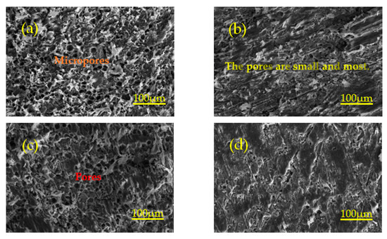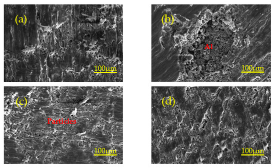The main function of sintering is to obtain the cross-linking of polymer matrix and to fuse the particles with PTFE matrix to form a composite with certain strength and hardness. If the crystallinity of materials is different, the strength is also different. Because the sintering temperature of 315 °C can make the crystallization speed of PTFE matrix the fastest, it can be kept at this temperature for a certain time to improve the crystallinity of the material, and then improve the strength and other mechanical properties of the material. The degree of crystallinity of PTFE matrix can be qualitatively judged by observing the micro factors such as voids, pores and the coating integrity of PTFE matrix and particles, so as to infer whether the mechanical properties of the specimen are good or bad. In Figure 13a,d, the bond tightness between PTFE matrix and particles is higher than that in Figure 13b,c. In Figure 13b,c, a large number of Al and TiH2 particles are exposed on the PTFE matrix, which leads to loose bonding between the PTFE matrix and particles, decrease of crystallinity and weak particle interface. In Figure 13b, except that some particles are exposed on the PTFE matrix, the bonding tightness between the other particles and PTFE matrix is higher than that in Figure 13c, so the mechanical properties of Figure 13b are better than that in Figure 13c. In Figure 13a,d, Al and TiH2 particles are tightly embedded in the PTFE matrix. In Figure 13a, the number of voids is more than that in Figure 13d, but the number of voids in both figures is very small. Therefore, the specimen corresponding to Figure 13d has the best mechanical properties due to the tight combination between PTFE matrix and particles inside the specimen.