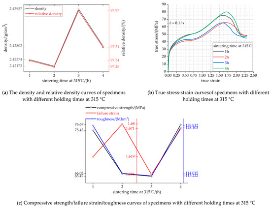 The density and relative density curves, true stress-strain curves and compressive strength/failure strain/toughness curves of specimens with different holding times at 315 °C are shown in Figure 12a–c, respectively. The specific parameters of Figure 12a,c are listed in Table 9.