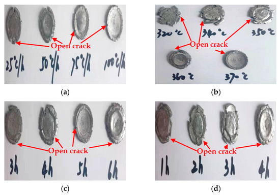 Deformation of static compression experiment specimen with different sintering parameters. (a–d) show the deformation of specimens with different cooling rates, different sintering temperatures, different holding times at 360 °C and different holding times at 315 °C after the static compression test, respectively.