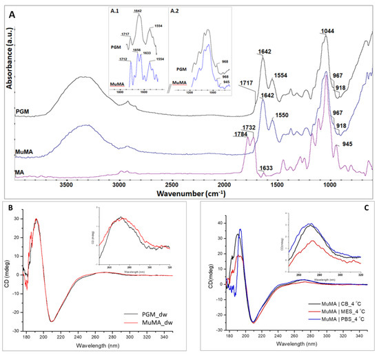 (A) FTIR spectra of PGM (black), MuMA (blue), and MA (purple); inset A.1: deconvoluted spectra of PGM and MuMA in the wavenumber region 1500–1750 cm−1; inset A.2: deconvoluted spectra of PGM and MuMA in the wavenumber region 850–1200 cm−1; (B) CD spectra of PGM and MuMA; inset: magnification in the 250–320 nm region; (C) CD spectra of MuMA|MES, MuMA|PBS, and MuMA|CB at 4 °C; inset: magnification in the 250–320 nm region.