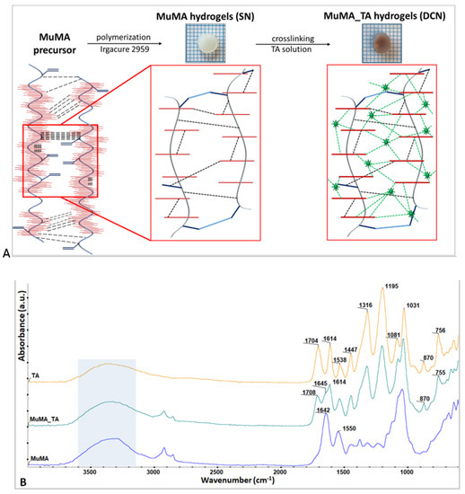 (A) Schematic representation of the synthesized SN and DCN systems (blue: “C–C” covalent bonds formed through the polymerization of “C=C” groups in MuMA; dashed black: intra- and intermolecular H-bonds in MuMA; dashed green: TA-MuMA H-bonds); (B) FTIR spectra of TA (orange), MuMA_TA (teal), and MuMA (blue).