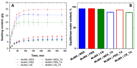 After swelling equilibrium was reached, EWC values were computed, which are represented in Figure 3B. Although there are no significant differences between the EWC of the SN systems, the data show that the formation of the secondary network had a different impact on the obtained DCN systems. The EWC computed for the systems that were synthesized in MES presented the highest difference between SN (96.24 ± 0.19) and DCN (87.47 ± 2.5), while the MuMA|PBS registered a value that is only 3.79% higher than MuMA|PBS_TA. This behavior is also a confirmation of the different orientation of the functional groups in MuMA structure during the photopolymerization process due to the pH value of the dispersion media, which ultimately leads to a more unfolded (in the case of MES) or folded (in the case of PBS and CB) structure.