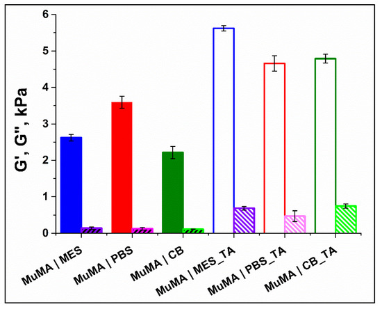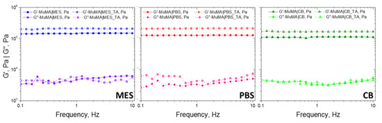 In addition to the macroscale mechanical properties of the synthesized materials, the study also offers important insights regarding their properties at microscale, as obtained through nanoindentation tests. Surface mechanical properties are of great interest when considering biomedical applications since they influence the cellular behavior [48]. As mentioned by Youssefian et al. [49], H-bonds act as springs between atoms and have a significant influence on polymer chains’ arrangement and on their elastic behavior. Thus, the storage and the loss moduli of equilibrium-swollen hydrogels were evaluated also at microscale through dynamic instrumented indentation tests (Figure 5). Overall, the storage moduli increased after SN incubation in TA, suggesting the surface reinforcing of the hydrogels. Such behavior may be assigned to MuMA–TA H-bonds formation, resulting in DCN. Furthermore, the surface elasticity placed the SN hydrogels in the order of MuMA|PBS < MuMA|MES < MuMA|CB, and TA treatment changed this pattern to MuMA|MES_TA < MuMA|CB_TA < MuMA|PBS_TA. TA exhibited a lower influence on MuMA|PBS (29.58% increase). For MuMA|CB, a doubling of the storage modulus was observed after TA incubation (97.85% increase). The highest increase in storage modulus after TA treatment was recorded for MuMA|MES_TA (114.45% increase). This is consistent with the CD results, where MuMA|MES presented the most unfolded structure, and therefore it was expected that this composition provides the most available sites to H-bond formation and hence a more pronounced TA-cross-linking effect