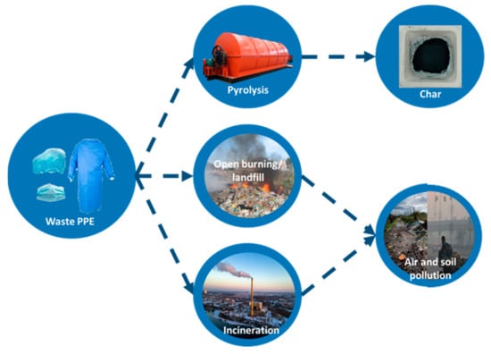 The Ministry of Health (MOH) Malaysia used personal protective equipment (PPE) made from non-woven fabric polypropylene (PP) to fabricate masks, isolation gowns, hair nets, and shoe covers []. Currently, 59 million units of PPE are being used by health staff under the MOH per month. As a result, approximately 2.124 billion units had been utilized over the course of two months []. Thus, high utilization of plastic products will lead to high production of environmental plastic waste. Generally, polypropylene waste (PP) takes 20–30 years to decay completely. These plastics contain additive materials—including colorants, plasticizers, and stabilizers—composed mainly of cadmium and lead [], which are harmful to the environment. As mentioned by Verma et al. [], waste plastics can make up as much as 28% of overall cadmium in urban solid waste. Thus, plastic waste can emit significant contaminants into the atmosphere when burned openly. Due to these harmful impacts of plastic waste and its management practices on the environment, more environmentally sustainable methods for plastic waste disposal should be created.