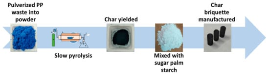 Some studies on the calorific value of char briquettes are summarized in Table 1. From the existing literature, only a few works on plastic pyrolysis char were evaluated for solid fuel briquettes, due to the limited char yields from laboratory-scale experiments. Thus, there was no pre-existing scientific study in which solid product char obtained from pyrolysis of PP waste was used as briquette char. Pyrolysis studies related to PP waste are generally catalytic pyrolysis studies, and only pyrolysis product properties were examined in these studies []. Conversely, our work presents the pyrolysis of real PP waste and the preparation of briquettes from pyrolysis char. In this study, PP waste derived from COVID-19 isolation gowns was pyrolysed in the batch pyrolysis reactor, and the influence of binder varieties on the quality of the resulting briquettes was investigated.
