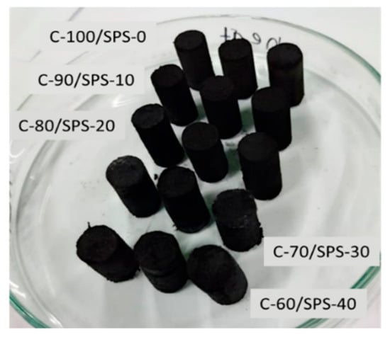 The density of the charcoal briquettes was determined 72 h after compaction using an analytical balance and a digital calliper. The density results were calculated using the mass-to-volume ratio of each briquette. Figure 3 represents the fabricated briquettes in cylindrical shapes. The mechanical strength of charcoal was calculated using a compression test. An Instron 3382 universal testing machine (High Wycombe, UK) was used to determine compressive strength in accordance with ASTM D695 []. The modification and starting speeds were both 0.3 cm min−1. The yield and the compressive strength of the samples were measured using this test.