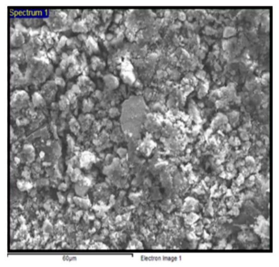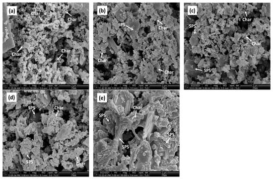 The microstructural and morphological analysis of the char/sugar palm starch (C/SPS) composites was conducted using the FESEM method. The mechanical structure’s relation to the mechanical strength of the briquettes was determined via morphological analysis. Figure 4 depicts the morphological analysis of the C/SPS briquettes at the high magnification of 50k×. Based on the observations, it was found that the microstructure of the briquettes is apparently finely textured for C-100/SPS-0, but has a coarse and rigid structure for C-90/SPS-10, C-80/SPS-20, C-70/SPS-30, and C-60/SPS-40 briquettes. This is due to the presence of SPS as the binder inside the composites, which can be observed from the increased amount of SPS, as shown in Figure 4 [,]. This microstructure proves that good bonding of the fine particles and decreased porosity were obtained for the briquettes with SPS loading compared to the neat ones.