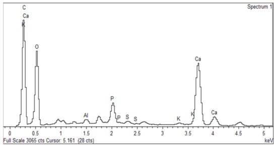 EDX analysis was carried out in order to study the elemental properties of the char briquettes as shown in Figure 5. The contents of the char briquettes, generated from the EDX results, are displayed in Table 2. From Figure 6, the dominant element in the C/SPS composites is carbon (43.28%), although the atomic percentage of oxygen is higher, at 46.14%. This is due to the high moisture content within the briquettes; thus, this finding is in line with the FTIR spectra (see Figure 7) and TG analysis (see Figure 8). Carbon and oxygen are accompanied by other low weight percentage elements, including calcium (7.91%), phosphorus (1.91%), sulphur (0.25%), and aluminium (0.34%). Table 2 shows the lists of other elements. Based on the work of Basu [], P, Al, Ca, and K are the primary components of the ash that formed during pyrolysis as parts of the char yielded.