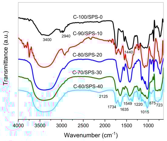 ATR–FTIR spectra of PP char reinforced with SPS briquettes C-100/SPS-0, C-90/SPS-10, C-80/SPS-20, C-70/SPS-30, and C-60/SPS-40 show consistency in their functionality and characteristics, as shown in Figure 7 IR spectra for the briquettes represented changes in the bands occurring in the proximity of 4000 and 600 cm−1, which then explained the qualitative and quantitative analyses for the identified chemical bonds and chemical compounds in a wide range of capacities. The changes that happened were mainly due to increasing starch content within the samples. Broad absorption bands with strong intensity at a range of 3400–3300 cm−1 corresponded to the hydroxyl –OH groups’ stretching and bending, which caused the physisorption of moisture adsorbed onto the surface of the briquettes []. The C–H stretching of the aliphatic groups methyl, methylene, and methane existed in the char results in a narrow band at 2940 cm−1. The stretching of the C=O conjugated and unconjugated (carbonyl/carboxyl) bonds of carboxylic acids within the starch was consistent with the peak at 1734 cm-1. The area of the spectrum between 1400 and 1500 cm−1, or 1550 and 1600 cm−1, demonstrated the presence of C=C stretching vibrations due to aromatic rings, and an intense absorption peak of stretching vibration from the C=C bonds of alkenes arises in the spectral range of 1600–1680 cm−1 [,]. In the briquettes spectrum, the high intensity absorption peaks were discovered at 1429 cm−1 and 1560 cm−1 (C=C), and 1640 cm−1, respectively. Vibrations in C–O, C=C, and C–C–O within the char and SPS provide one of the most pronounced bands in the area, between 1031 and 1034 cm−1. Sogancioglu et al. [] mentioned that the distinct peaks in the spectral regions between 800 and 900 cm−1, and 700 and 800 cm−1 represent p-disubstituted benzene aromatic C–H and alkene groups. The distinct peaks at 876 cm−1 and 723 cm−1 were observed from the IR spectra, respectively. Conclusively, aliphatic bands and alkene bands were reduced greatly with the increase in SPS content. This was due to successful binding of the char materials with the starch, which then produced rigid structures and high mechanical strength, as represented in Table 5.